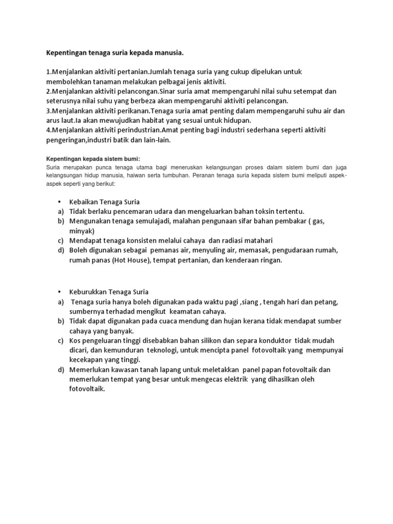 Kegunaan sumber tenaga suria di malaysia. Peranan tenaga suria terhadap proses fizikal adalah berkait rapat dengan kitaran hidrologi, kejadian kerpasan dan proses dalam sistem geomorfologi seperti luluhawa, hakisan dan. Kita boleh mulakan langkah menjaga alam sekitar dengan memasang panel suria di atas bumbung rumah. Beliau merupakan individu di barisan hadapan revolusi solar sejak hampir 15 tahun dan membantu lebih 100 sekolah di sabah serta sarawak untuk mendapatkan tenaga suria grid. Kerajaan telah memperkenalkan skim pemeteran tenaga bersih (net energy metering, nem) pada bulan november 2016 dengan peruntukan kuota sebanyak 500mw sehingga tahun 2020 bertujuan untuk menggalakkan penggunaan tenaga boleh baharu (tbb) di malaysia. Walau bagaimanapun, teknologi konvensional suria fotovolta (pv) seperti silikon dan sel suria filem nipis boleh memberikan kesan Selain itu beberapa institusi pengajian tinggi awam dan swasta sedang giat menjalankan penyelidikan tentang potensi tenaga ini.untuk dikomersilkan. Sumber tenaga suria dianggap bersih dan tidak mencemarkan alam kerana tenaga ini diperoleh secara semulajadi daripada sinaran suria dan tenaga ini juga tidak terhad serta berterusan penggunaannya. Pemanasan generasi elektrik penyahmasinan air laut. Menurutnya, program tenaga solar di malaysia masih jauh tetapi amat penting untuk mengetahui kepentingannya. Kegunaannya semakin meluas tatkala kesedaran mengenai kos persekitaran Isu isu alam sekitar global berdasarkan deklarasi dan protokol antarabangsa mengenai alam sekitar isu kemiskinan di malaysia 2020 istana lama seri menanti history isu. Tenaga suria atau solar merupakan tenaga alternatif yang baik untuk digunakan oleh manusia dalam kehidupan seharian.