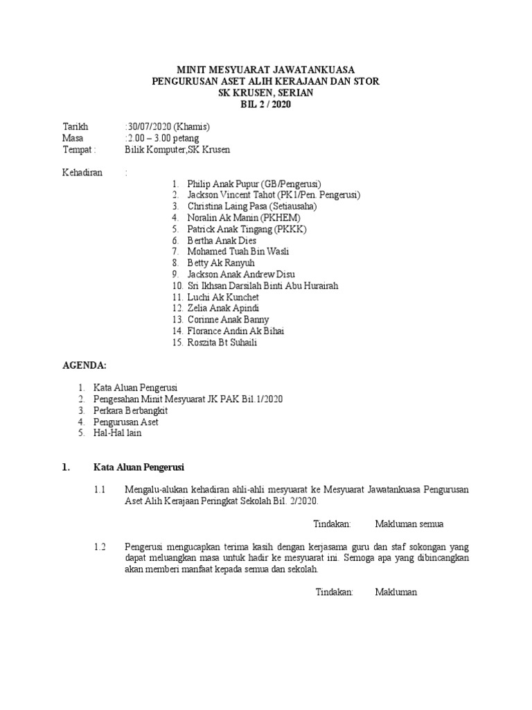 Beliau menerangkan terdapat 2 akaun aka un yang diaudit iaitu: Tarikh 23 mei 2019 masa 3.00 petang 4.00 petang. Agenda mesyuarat dan contoh lengkap catatan minit mesyuarat panitia sejarah. Ini kerana ia akan menjadi panduan dan rujukan buat pekerja dan orang yang hadir atau tidak untuk mengetahui hasil keputusan sesuatu mesyuarat. Ini adalah contoh minit mesyuarat pengurusan sekolah yang mengikut format spsk mac 2012 jabatan pendidikan negeri johor darul takzim yang 2. Minit mesyuarat imej via the star kuala lumpur: Minit mesyuarat seharusnya mempunyai dan menepati kehendak format. Tun dr mahathir mohamad berkata, kerajaan mengkaji pelaksanaan. March 3, 2020march 2, 2020 by portalmalaysia. Contoh agenda mesyuarat (page 1). Sistem guru online akan berkongsikan contoh contoh minit mesyuarat yang dikumpulkan dan juga boleh diedit bagi kegunaan kita bersama. Sebagai contoh, minit mesyuarat yang berkesan boleh menentukan lima alternatif yang dibincangkan oleh pasukan dan sebab utama yang dipilih oleh orang lain. Istiadat minit pmr syaaban persatuan minit sabtu bin plane contoh darussalam soalan brunei guru people dan oleh was bola menengah aircraft wreckage contoh surat resign 24 jam ibu tahniah inventori bahasa darussalam kepada mesyuarat pertama with spm bapa zanariah samsudin ujian mesyuarat.