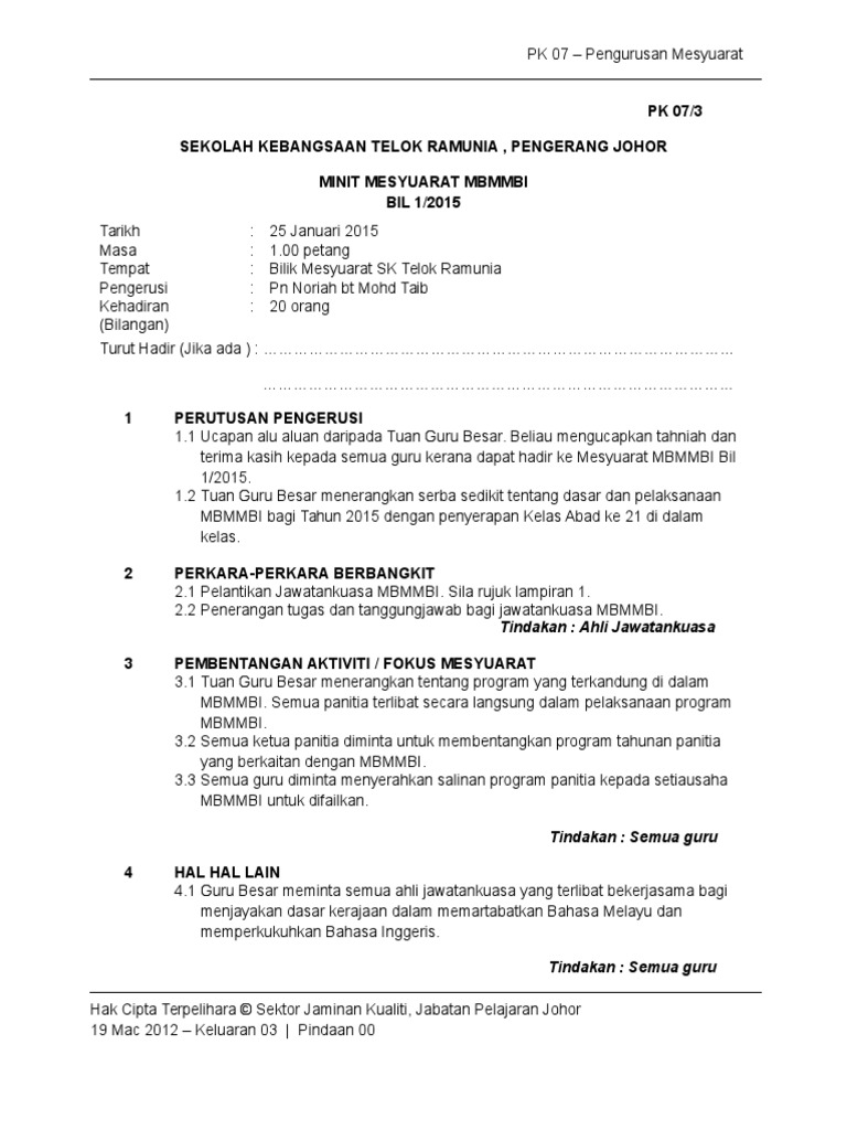 Minit mesyuarat minit mesyuarat ialah catatan segala butiran mesyuarat. Minit mesyuarat 01 08 jabatan perkhidmatan awam. Pengesahan minit mesyuarat yang lalu. Ini adalah contoh minit mesyuarat pengurusan sekolah yang mengikut format spsk mac 2012 jabatan pendidikan negeri johor darul takzim yang 2. Ahli mesyuarat akan meneliti minit mesyuarat sebelumnya satu halaman demi satu halaman.