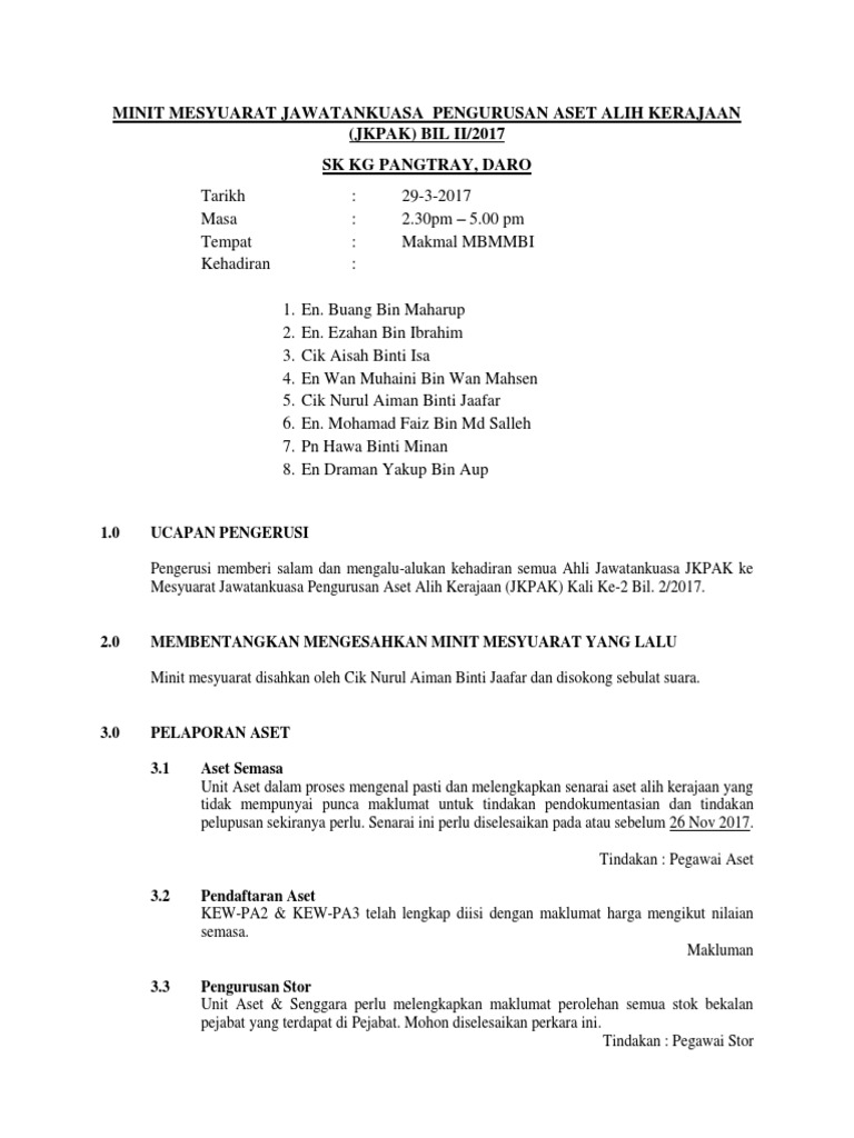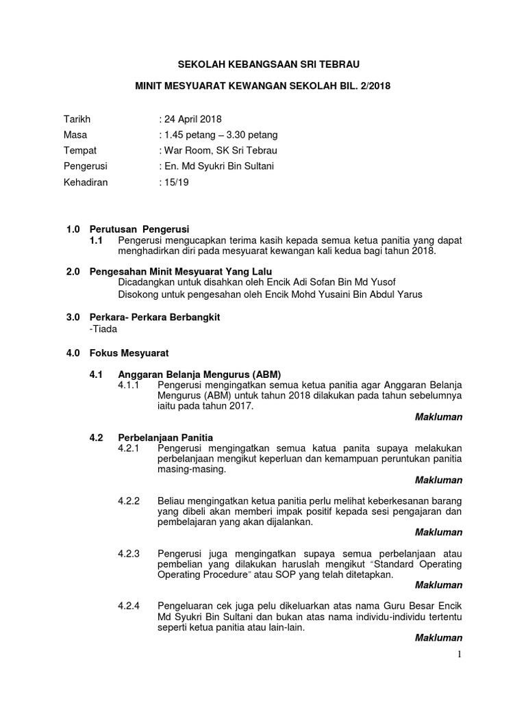 4 10 3 perlu ada senarai kehadiran borang tindak susul mesyuarat 4 10 4 minit mesyuarat dan borang maklum balas perlu diedarkan dalam masa dua minggu. Contoh format laporan kerja harian pegawai. Secara umumnya, format minit mesyuarat panitia adalah seperti berikut: Contoh penulisan minit mesyuarat untuk panitia bahasa melayu. Ini kerana ia akan menjadi panduan dan rujukan buat pekerja dan orang yang hadir atau tidak untuk mengetahui hasil keputusan sesuatu mesyuarat. Minit mesyuarat seharusnya mempunyai dan menepati kehendak format. Minit mesyuarat minit mesyuarat ialah catatan segala butiran mesyuarat. Pengesahan minit mesyuarat mesyuarat bersetuju mengesahkan minit mesyuarat. Koleksi manfaat yasinan di malam jumat doc. Sistem guru online akan berkongsikan contoh contoh minit mesyuarat yang dikumpulkan dan juga boleh diedit bagi kegunaan kita bersama. Ini adalah contoh minit mesyuarat pengurusan sekolah yang mengikut format spsk mac 2012 jabatan pendidikan negeri johor darul takzim yang 2. 48 beğenme · 2 kişi bunun hakkında konuşuyor. Text of contoh minit mesyuarat ringkas.