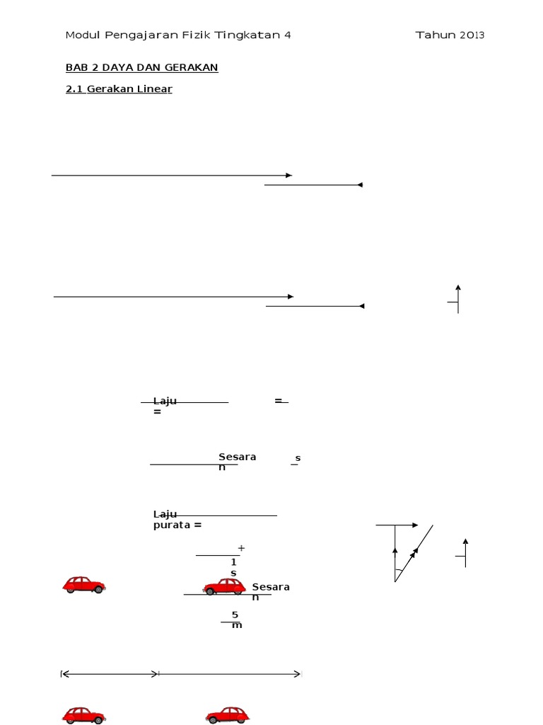 Bab 2 Daya Dan Gerakan Tingkatan 4 Fizik Cikgu Desikan Disunting Oleh Smk Changkat Beruas Perak Cikgu Pdf Document from demo.vdocuments.site Kuantiti fizik yang terlibat dalam gerakan adalah jarak (distance), sesaran (displacement), laju (speed), halaju (velocity), masa (time) dan pecutan (acceleration). 11.1.2 menjelaskan dengan contoh maksud laju, laju purata, halaju dan pecutan serta unit ukurannya dalam kehidupan harian. Daya berupaya untuk mengubah arah pergerakan di samping menggerakkan objek yang pegun. Objek yang sedang bergerak akan berhenti jika daya yang lebih besar dikenakan kepadanya. Daya ini menyebabkan semua benda yg dilambung akan jatuh semula ke tanah daya normal ialah daya. Daya gerakan linear 2 leraian daya id: Komponen mengufuk daya tegangan pada kabel = 3000 cos30° =2598n. F = ma (n) mengubah bentuk dan pergerakan sesuatu objek.vektor ( magnitud + arah ) daya impuls.